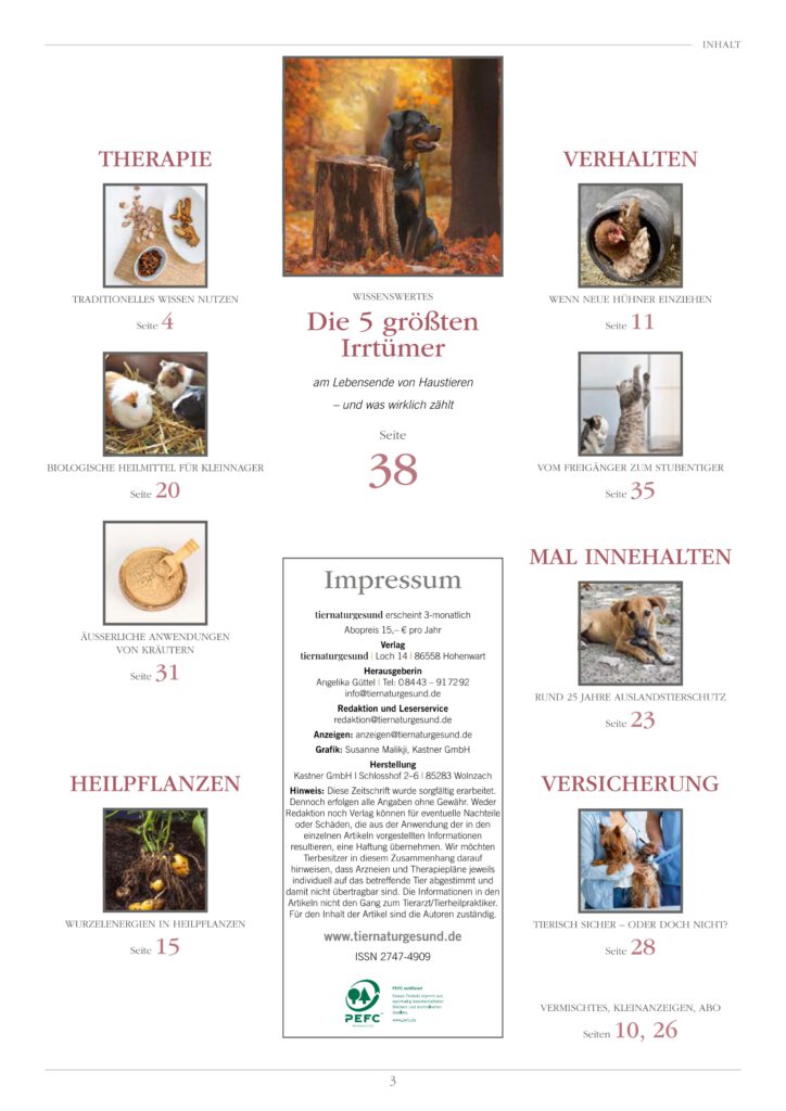 Das „tiernaturgesund Magazin“ steht für einen ganzheitlichen Ansatz zur Tierpflege und die Förderung eines bewussten Umgangs mit der Gesundheit Ihrer tierischen Begleiter. Tauche ab in eine Welt voller Wissen, Inspiration und Liebe für unsere Tiere. Hier geht es nicht nur um das Wohl der Tiere, sondern auch um die Bereicherung Ihrer Verbindung zu ihnen. Dein Schlüssel zu einer liebevollen und umfassenden Betreuung deiner tierischen Freunde.